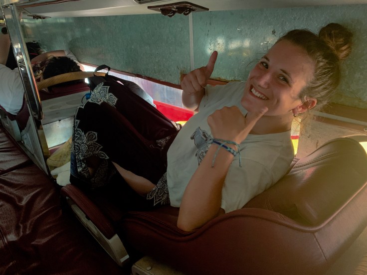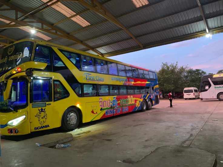 Night buses in Lao are… interesting. You get a bed, clean blankets and pillows, and a bottle of water. You also have to share these with a complete stranger. The bed is very much a western single. I didn’t manage to get a picture of the beds in this bus, but I got one of my bus back up to Vientiane from Don Det.